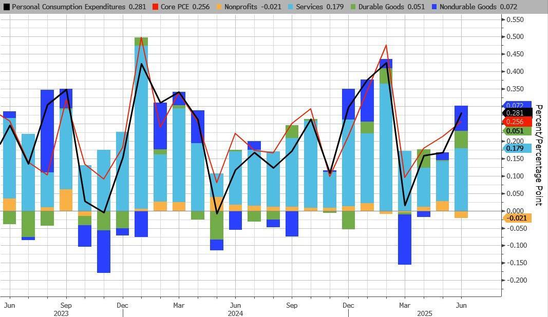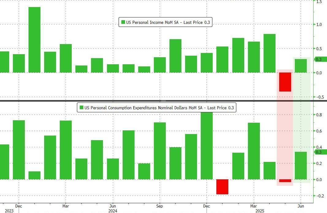 Both income and spending rose 0.3% MoM in June (after May's surprise decline in both)...