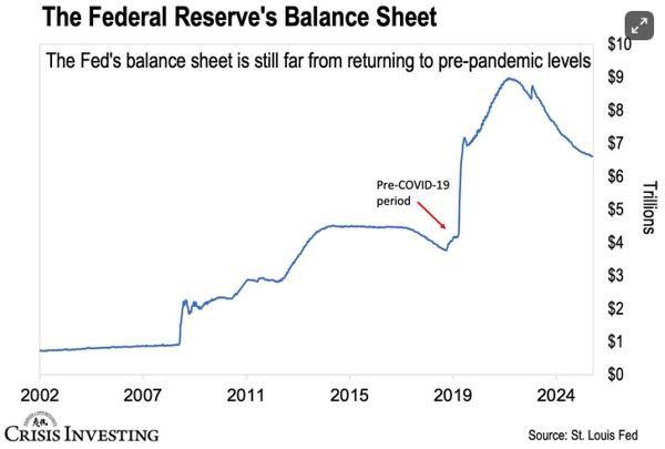 If you look at the chart below, you’ll see that since June 2022, the Fed has reduced its balance sheet by $2.2 trillion. That sounds impressive until you realize they’re still sitting on $6.6 trillion.