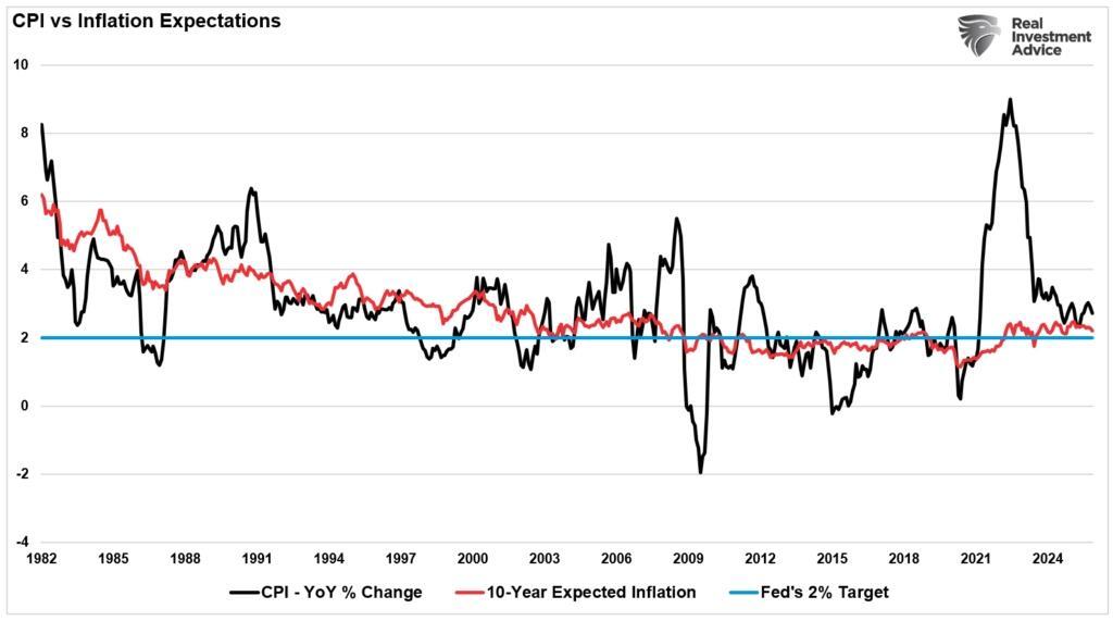 Let’s start with inflation. If economic growth were on the cusp of resurgence, expectations for inflation would be rising. However, as shown, those expectations never rose with “printed inflation,” because it was the “transitory effect” of massive monetary stimulus. The bond market’s view was that inflation would revert to its normalized levels as that monetary excess left the system, which has been the case. This is particularly notable, as inflation expectations have always been more accurate than the “inflation” bears we discussed yesterday.