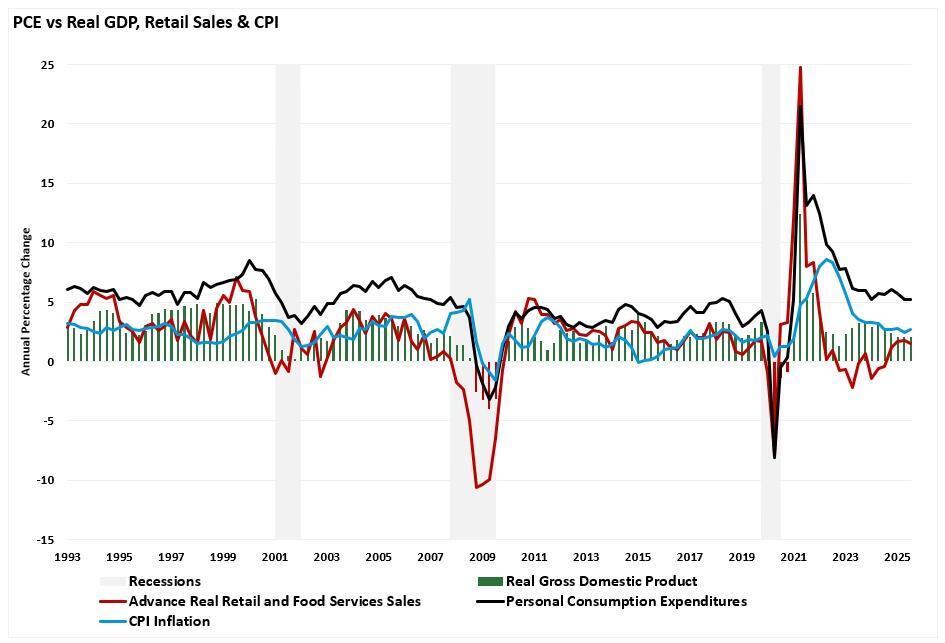 The retail sector provides early signals of demand weakness. Housing-related spending, auto sales, and discretionary purchases show stress, and many consumers face higher borrowing costs and lower savings. As shown, PCE, which accounts for nearly 70% of the GDP calculation, slowing inflation rates, and weak retail sales growth, all suggest that demand destruction is present in the economy. Such a development may further weigh on the Fed’s narrative of a soft landing.