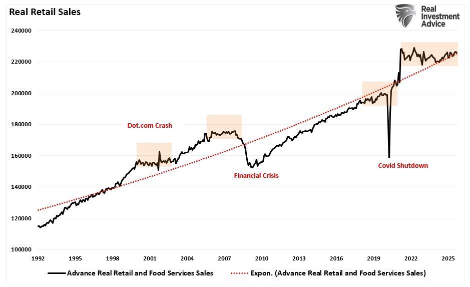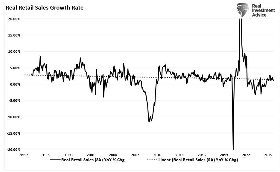 Wall Street’s forward expectations hinge on a growth rebound in 2026. Those projections assume that demand will return and margins will remain stable. However, there is no guarantee that either of those assumptions are accurate. If margins have already peaked, inflation declines as demand erodes, and employment falls, negative earnings revisions could be substantial. The year-over-year change in real retail sales, as shown in the chart, has hovered near recessionary warning levels. With consumers already strained by high debt service costs, weak wage growth, and declining savings, discretionary spending is under pressure, which directly affects earnings across cyclical sectors.