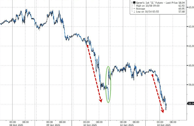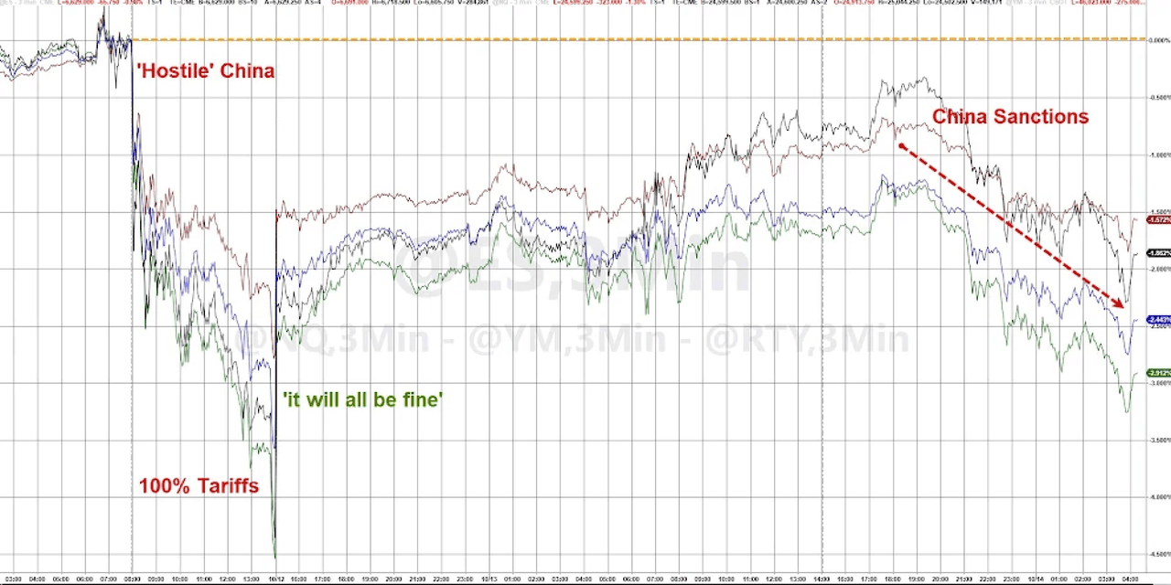 Global equity futures slipped on Tuesday after China vowed to "fight to the end" in its trade war with the U.S., following President Trump's threat last week to impose 100% tariffs on Chinese goods. Despite Washington's attempts to soften its tone over the weekend, tensions are intensifying into the new week: both countries are imposing new docking fees on each other's vessels, signaling deepening Sino-US relations ahead of Trump-Xi talks. Adding to the flaring tensions, Beijing sanctioned five U.S. subsidiaries of South Korean shipbuilder Hanwha Ocean, while U.S. Treasury Secretary Scott Bessent accused China of deliberately undermining the global economy.