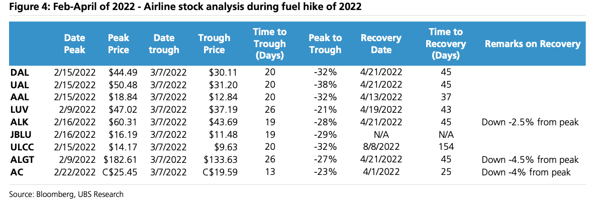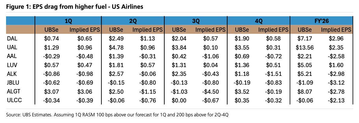 In an unlikely scenario where jet fuel stays at these levels in 2H'26 as well, it would imply about $3 in FY'26 EPS for DAL (vs. UBSe $7.17). LUV's EPS could be about $1.60 (vs. UBSe $5.05), and UAL's $2.35 (vs. UBSe $13.56). This is after assuming 200 bps higher RASM relative to our current estimates. AAL, ALK, and other smaller airlines would witness losses for FY'26 in this scenario. Full details on the impact for each airline by quarter are in figure 1.