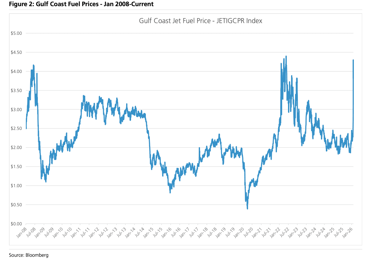 We note the impact on 1Q, while material, is cushioned by the fact the fuel spike happened late in 1Q and that airlines tend to carry 2 weeks of inventory. The impact on 2Q, though, could be significant. We continue to believe that DAL, UAL, and LUV are relatively better positioned to navigate higher fuel. AAL and several smaller airlines are more vulnerable.