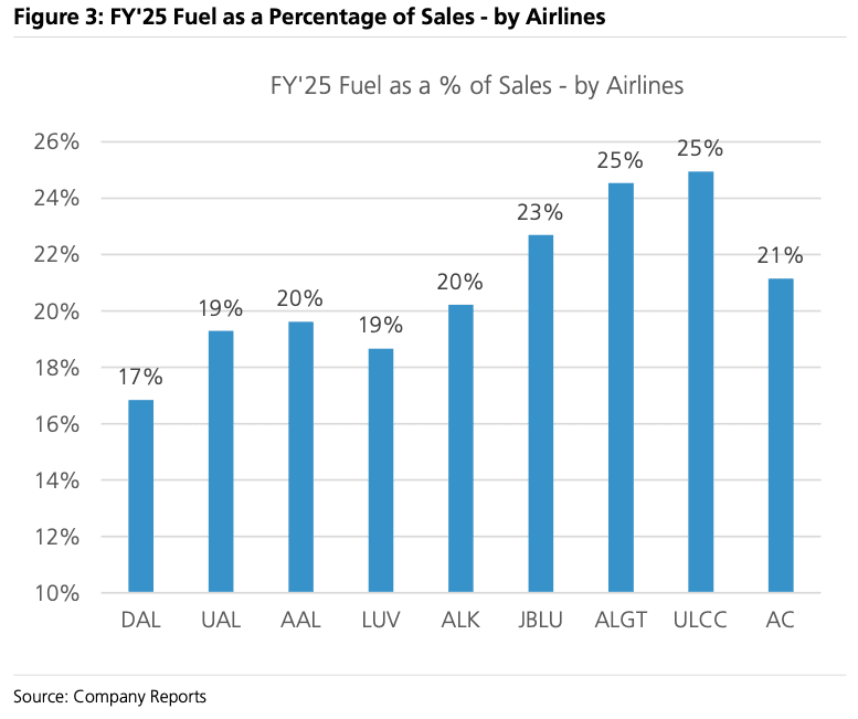 We assumed current fuel price (Gulf Coast $3.82/gallon) and added an incremental spread for distribution and other items based on the average historical spread reported by each for 2025. We also assumed 200 bps higher RASM relative to our published current estimate for 2Q in our analysis.