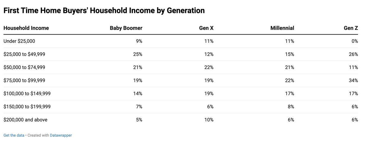 Income still plays a central role in homeownership access. While many first-time buyers earn between $50,000 and $75,000, a significant portion earn less, especially among older generations. Gen Z stands out again here, with relatively few buyers earning below $50,000. This trend reflects broader concerns among younger people about financial stability, shaped by growing up during the 2008 housing crash and entering adulthood amid pandemic-era economic turmoil.
