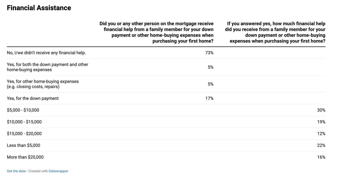 Contrary to popular belief, most first-time buyers didn’t receive financial help. About 73% paid for their homes without family assistance. Among those who did receive help, contributions varied, with 52% getting $10,000 or less. Just 16% received over $20,000, and only a small share received help from government programs.