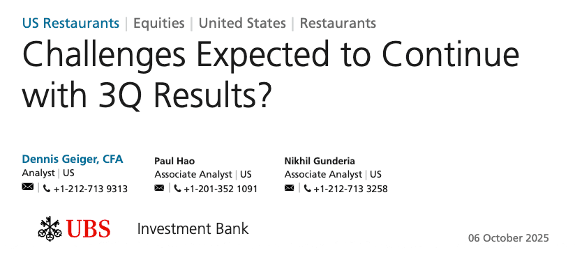Our investor discussions last week continued to highlight concerns around slowing industry demand trends and factors contributing to the traffic pressure, as well as the outlook for what could change into '26. Investors continue to view the restaurant sector as challenging and struggle to identify compelling long opportunities, while at the same time maintaining caution around potential shorts that could snap back. Fast casual remains the segment with the most investor attention as investors see potentially significant upside for several faster growth names if trends positively inflect. Investors are also focused on which names are best to own, with the most torque, on an eventual broader recovery in industry sales trends (WING, CMG often at the top of the list). Investors are also increasingly focused on expectations into 3Q earnings, with questions around what to own into results given a large percentage of the sector is expected to miss given recent weakness. Concerns continue around slower alt data trends in September, with the recent trajectory for many brands suggesting an early read into 4Q that Consensus expectations could prove too high.