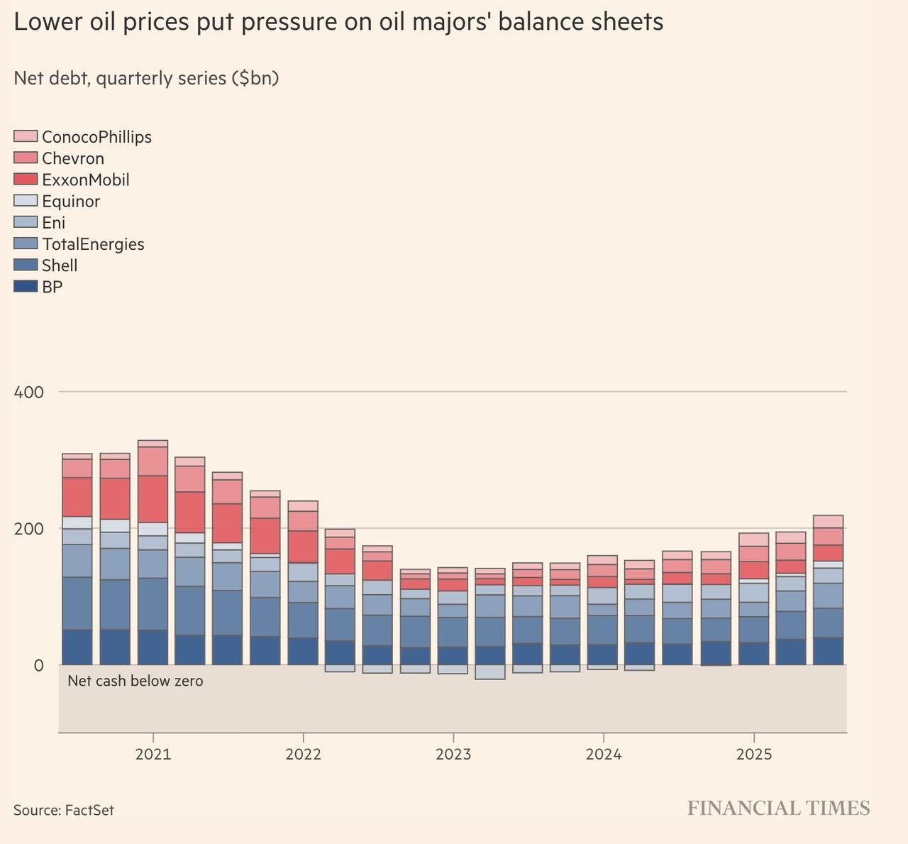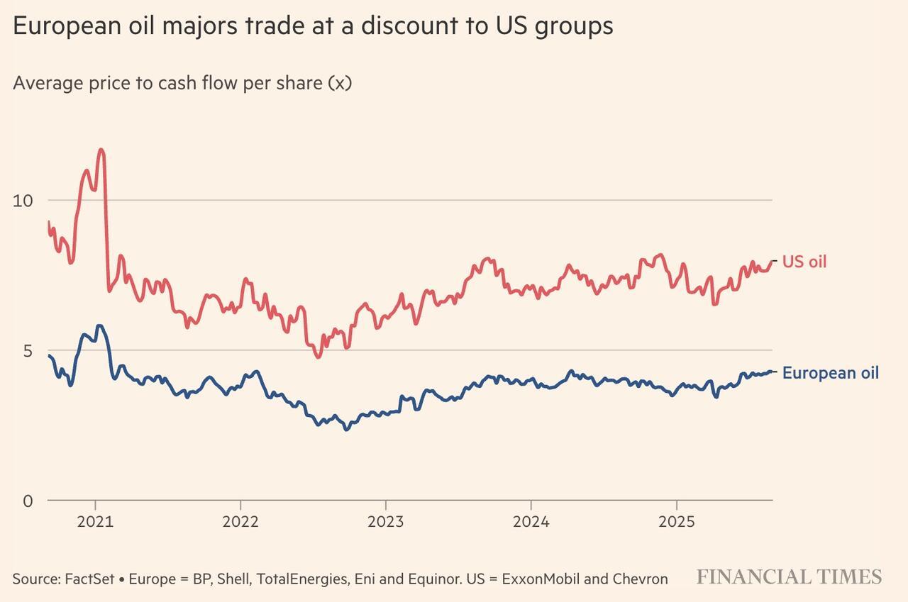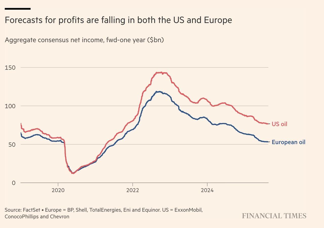 FT writes that the sector is under pressure as crude prices, which spiked after Russia’s invasion of Ukraine, have since dropped by half. Opec+ has shifted strategy, increasing output to regain market share, a move that adds further price strain. Analysts at Wood Mackenzie predict Brent could slide under $60 a barrel by early 2026 and stay there “up to a few years.” Below that level, western majors struggle to fund both shareholder payouts and new projects.