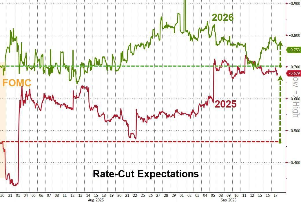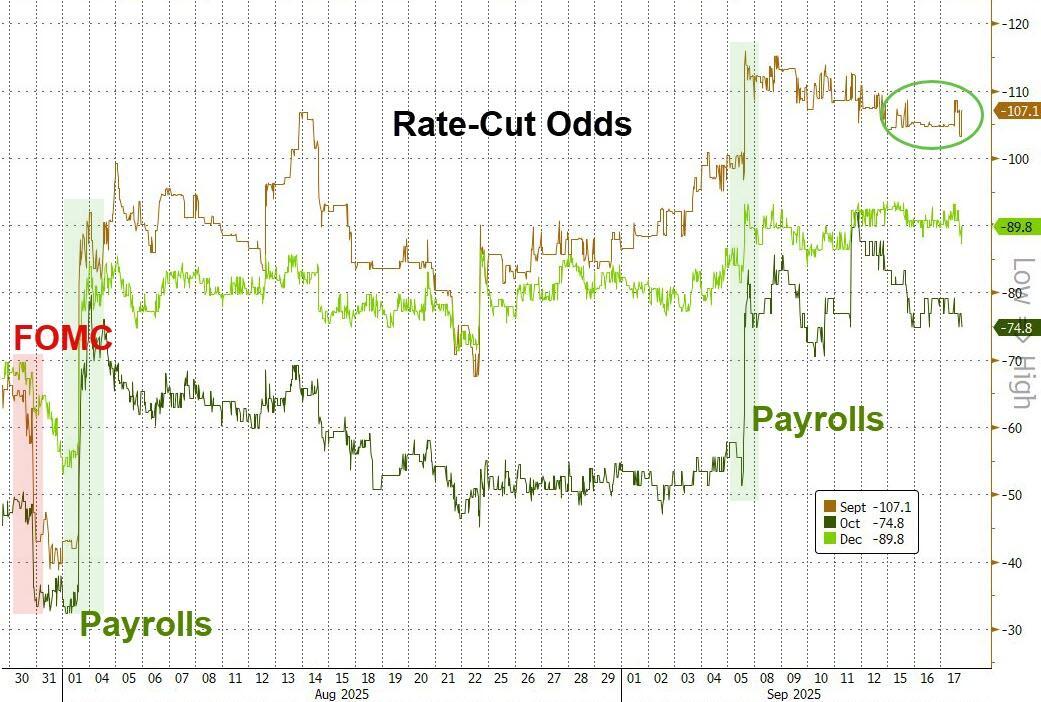 Rate-cut odds dipped after the last FOMC meeting only to surge on two weak payrolls prints, pricing in fully a 25bps today (and high likelihood of another cut in each of the remaining FOMC meetings this year)...