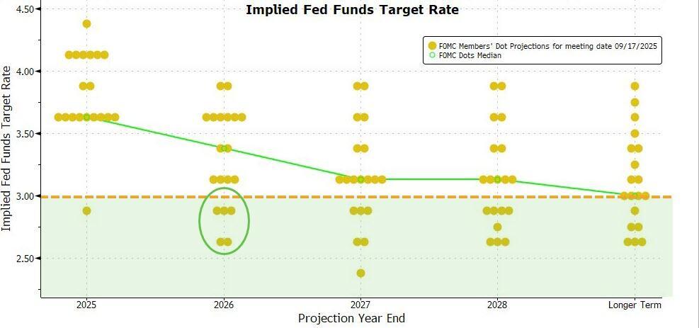 Bloomberg's Ira Jersey notes that while the skew of the Dot-plot remains for slower cuts this year, the median year-end 2026 dot not only moved lower, but there are now five members who see rates below 3%.