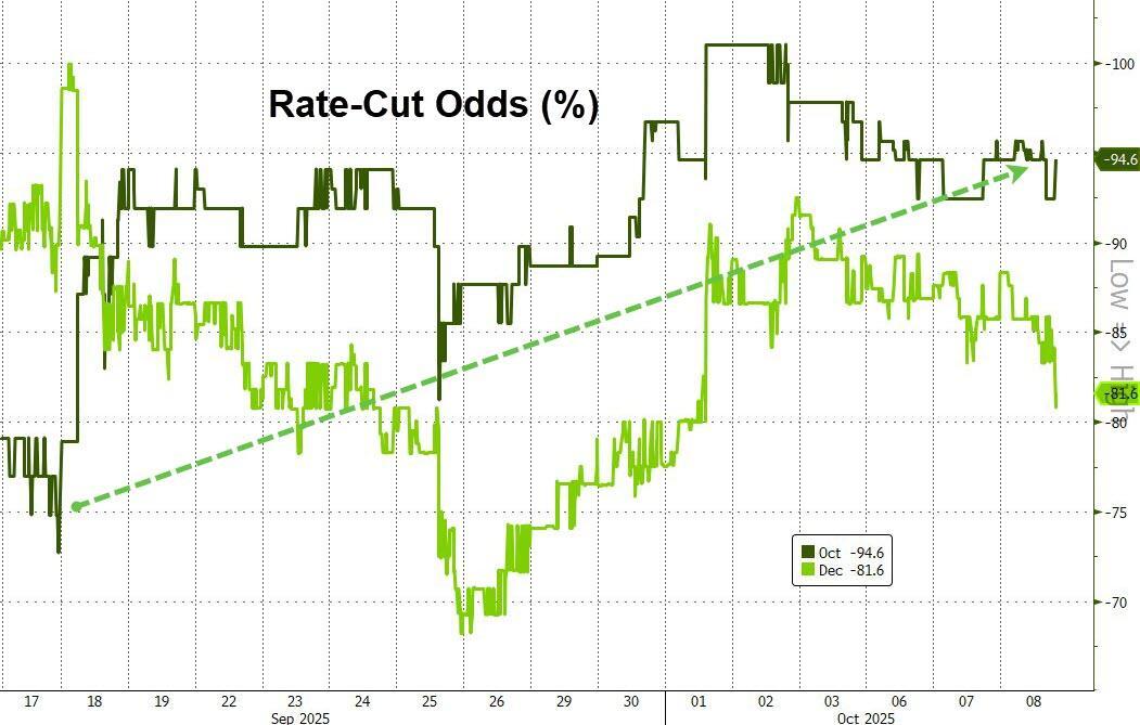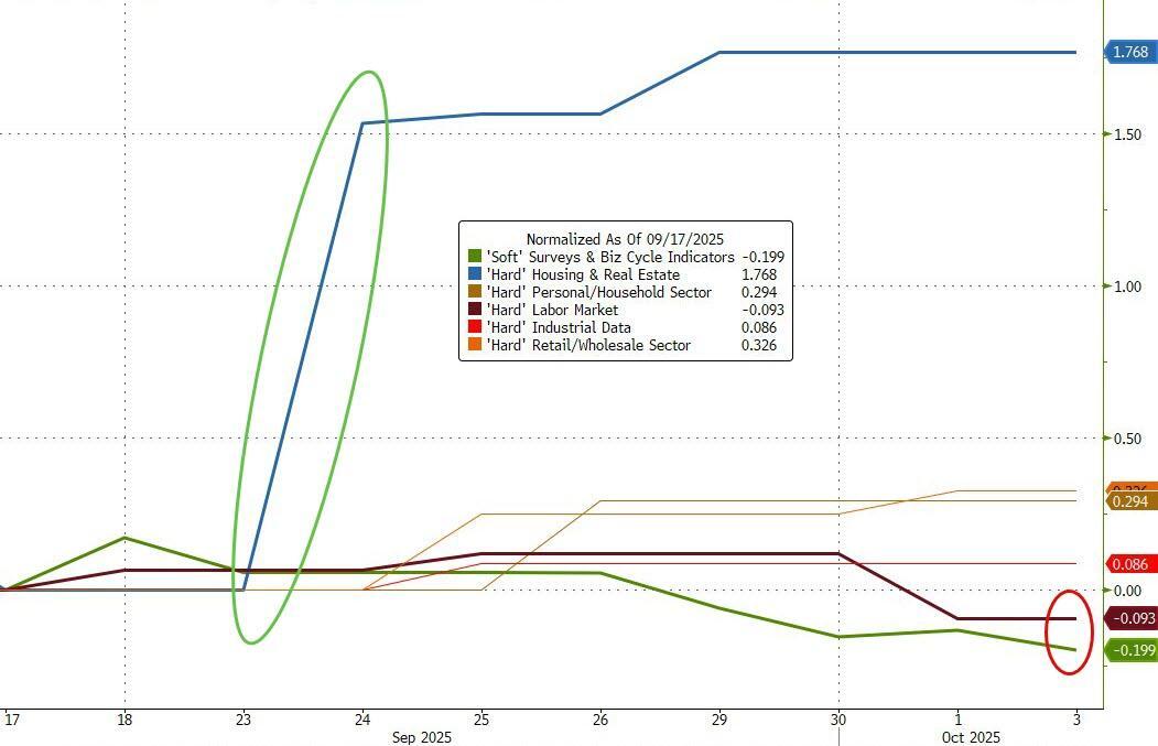 Despite the lack of data (due to the government shutdown), the labor market is cooling, and now policymakers are turning their attention to that side of the mandate (though we note that housing data saw a huge upside surprise while soft survey data since the FOMC meeting has weakened)...