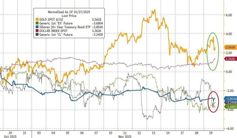 Since the last FOMC meeting (Oct 29th), gold is the best performing asset (along with the dollar) as bonds, stocks, and oil are all down notably...