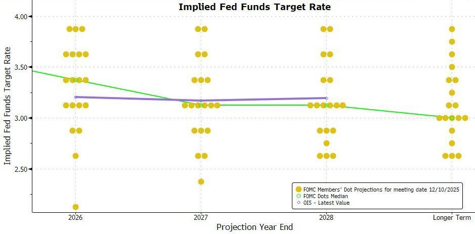 The market is now more only modestly more dovish than The Fed's dots for 2026 (but the market is also not pricing in any more moves from The Fed after that)...