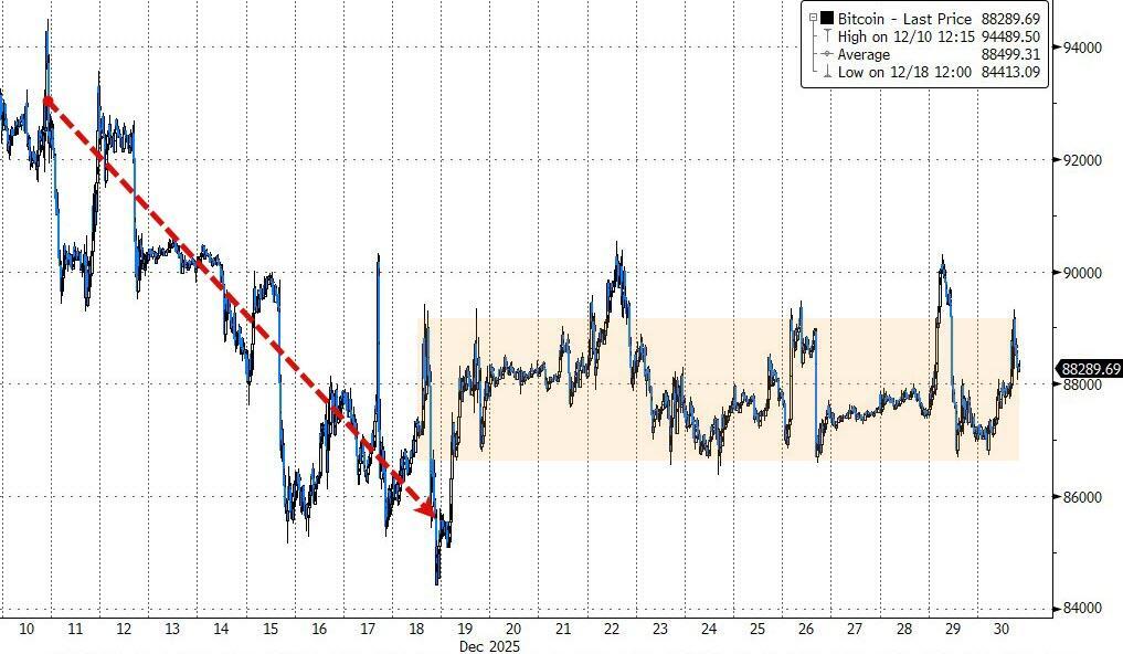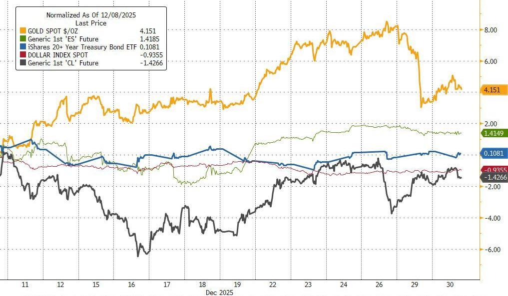 Since the last FOMC meeting on Dec 10th (which resulted in a more-dovish-than-expected 25bps rate cut along with 3 dissents), precious metals have been the biggest gainers (as the dollar weakened) while crude oil has been a laggard. Stocks small bid, bonds unch...
