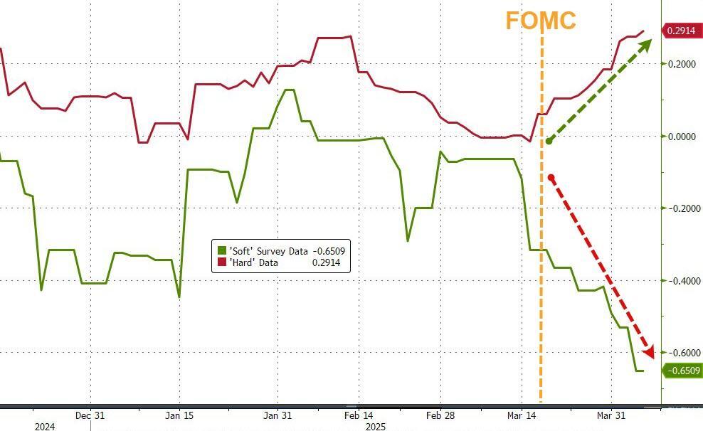 In the three weeks since the FOMC meeting, hard data has improved significantly while soft data has crashed...