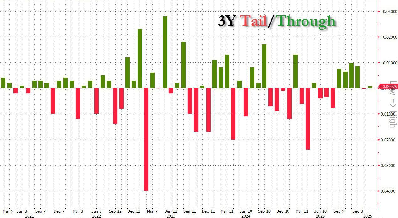 The auction stopped at a high yield of 3.518%, down from 3.609% in January and the lowest yield since Sept 2025; the auction also stopped through the 3.519% When Issued b 0.1bps, the 6th consecutive stop through for the 3Y tenor.
