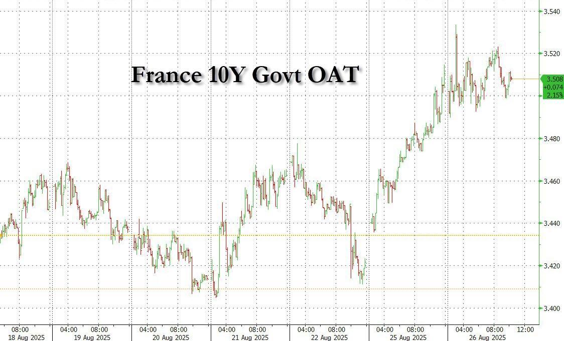 And just like that, Europe is gripped by another political crisis (but... but... the euro is soaring) after French Prime Minister Francois Bayrou called a confidence vote that may topple France’s government as soon as September 8, prompting a selloff in French assets as investors hedged for more political uncertainty.