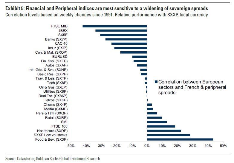 While Goldman naturally sees French domestic stocks as the most sensitive slice of the market to French political risks, the bank shows in the chart below other European indices and their long-term correlation with sovereign spreads (French and Peripheral spreads). Southern European indices, Banks, CAC 40, Cyclicals and the EUR tend to be most sensitive, while Consumer Staples, Healthcare, Low vol stocks and FTSE 100 are most positive positively correlated (in terms of relative performance) when sovereign spreads widen.