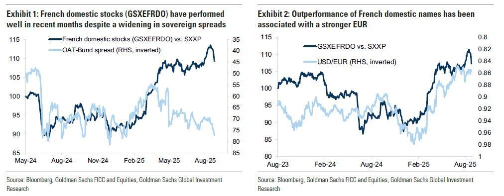 ... which is to be expected: as these Goldman charts show, French domestic stocks have performed well in recent months despite a widening in sovereign spreads which may well have sensed that this showdown is coming.