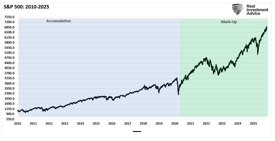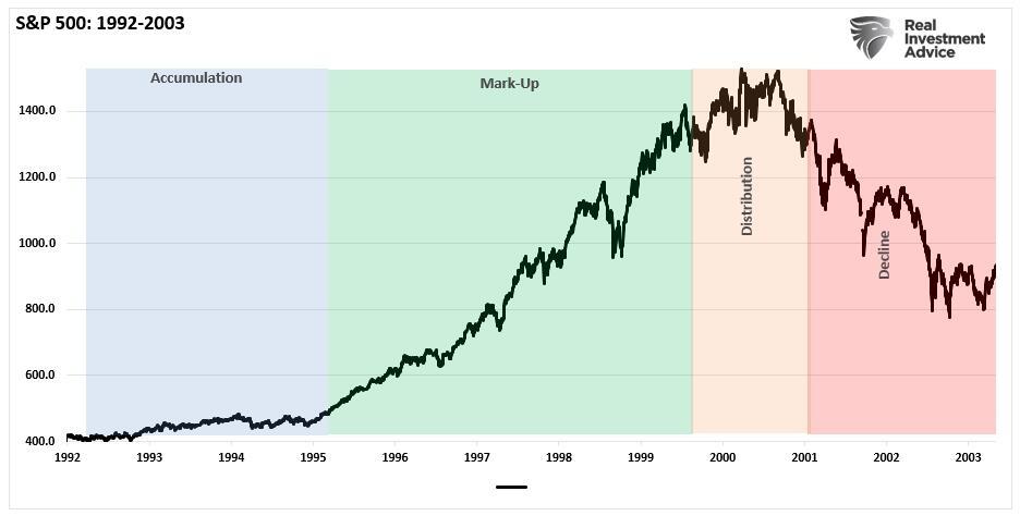 The accumulation phase, following the 1991 recessionary environment, was evident as it preceded the “internet trading boom” and the rise of the “dot.com” bubble from 1995-1999. As I noted previously: