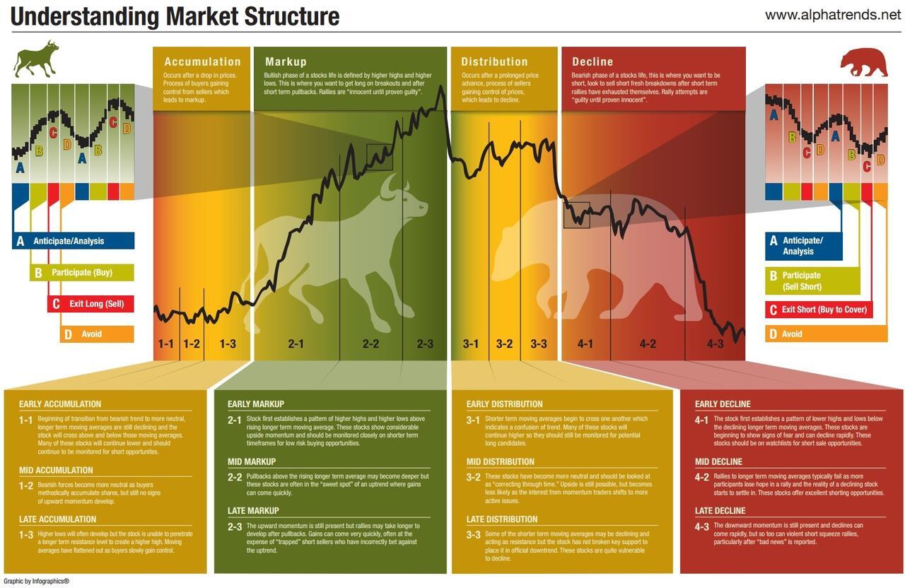 The following infographic explains the four important phases of market trends, based on the methodology of the famous stock market authority Richard Wyckoff. The theory is that the better an investor can identify these phases of the market cycle, the more profits can be made on the ride upwards of a buying opportunity.”