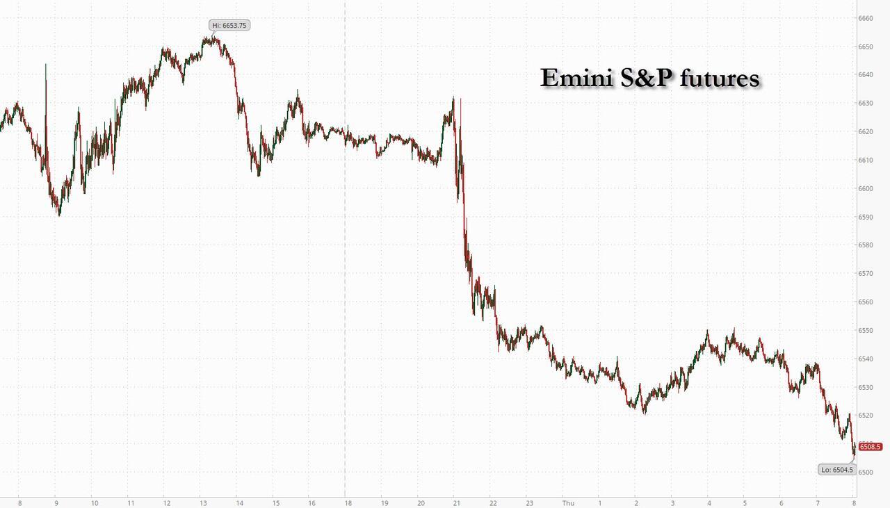 Global risk assets, including US equity futures and global markets, as well as Treasuries and precious metals, tumbled as oil soared with Brent hitting $110 this morning after Trump's late Wednesday speech refused to pivot and dashed hopes that the Hormuz Strait would reopen soon and the war in the Middle East is nearing a swift resolution. As of 8:00am ET, S&P 500 futures dropped 1.7%, reversing yesterday's short squeeze as investors refuse to add to risk positions ahead of the long weekend when many speculate a ground invasion of Iran may begin. Nasdaq 100 contracts slumped 2% amid a premarket selloff in big tech stocks and chipmakers. Tech is getting hit hard with Mag7 and Semis lagging while Cyclicals ex-Energy are underperforming Defensives with both Staples and Healthcare down in absolute terms pointing to broad-based de-risking into the holiday weekend. Energy should have a good day as investors re-gross in the sector and Integrateds are trading up ~3% pre-mkt. Brent soared 8.2% to more than $109 a barrel after Trump pledged more aggressive action against Iran and offered no concrete plans to reopen the Strait of Hormuz. European diesel futures hit $200 a barrel. Bonds tumbled as expectations that oil prices will stay higher for longer prompted traders to initiate fresh bets on tighter monetary policy. The dollar advance the most in a week while gold snapped a four-day streak of gains. US economic data calendar includes March Challenger job cuts (7:30am New York time), February trade balance and weekly jobless claims (8:30am). Fed speaker slate includes Logan (10:15am) and Bowman (12:45pm)