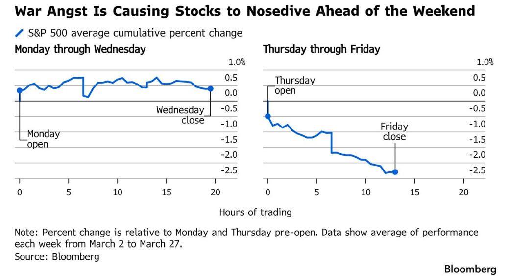 The US stock market has settled into a predictable weekly pattern since the Middle East war began. It starts the week on a strong note, drifts sideways toward the middle of the week and then collapses every Thursday and Friday, reflecting likely de-risking into a “trading blackout with unknowable risks.”