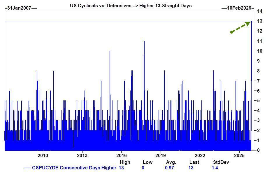 As we noted yesterday, Goldman’s Cyclicals vs. Defensives basket is on its longest rising streak in years. “You don’t get moves like this unless the market is starting to lean into a better growth outlook,” wrote Goldman Sachs managing director Lee Coppersmith.