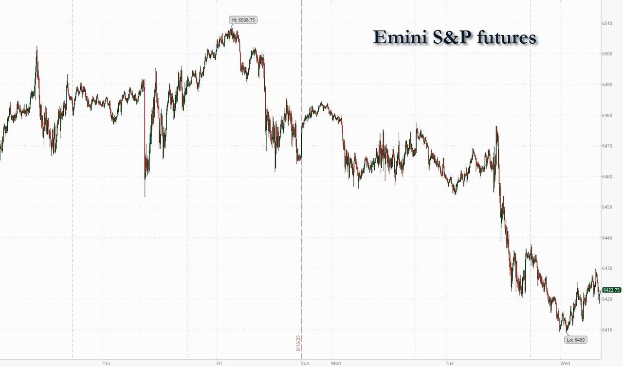 US equity futures are down and headed for a 4th day of losses, but trade well off session lows as markets assess if the sharp momentum selloff we have discussed for the past week will extend into today's session: the JPM Momentum Basket (JPMPURE Index) is down more than 7% since the CPI print while Goldman said it's time to resume buying momentum factor. As of 8:00am S&P futures are down 0.2%, after dipping 0.5% earlier in the session; Nasdaq futures are also down 0.2% after the index logged its second-biggest decline since April on Tuesday, with Mag7 names lower premarket ex-NVDA/MSFT; Defensives are outperforming Cyclicals. According to JPM "today feels like a test for the dip-buyers, as Flash PMIs tomorrow and Powell at Jackson Hole on Friday may prove to be market movers/narrative changers." The yield curve is twisting flatter with the USD not flat. Commodities are seeing a bid across all 3 complexes highlighted by WTI. The macro data today is mortgage applications and Fed Minutes with tomorrow delivering Flash PMIs, jobless data, leading index, and existing home sales.