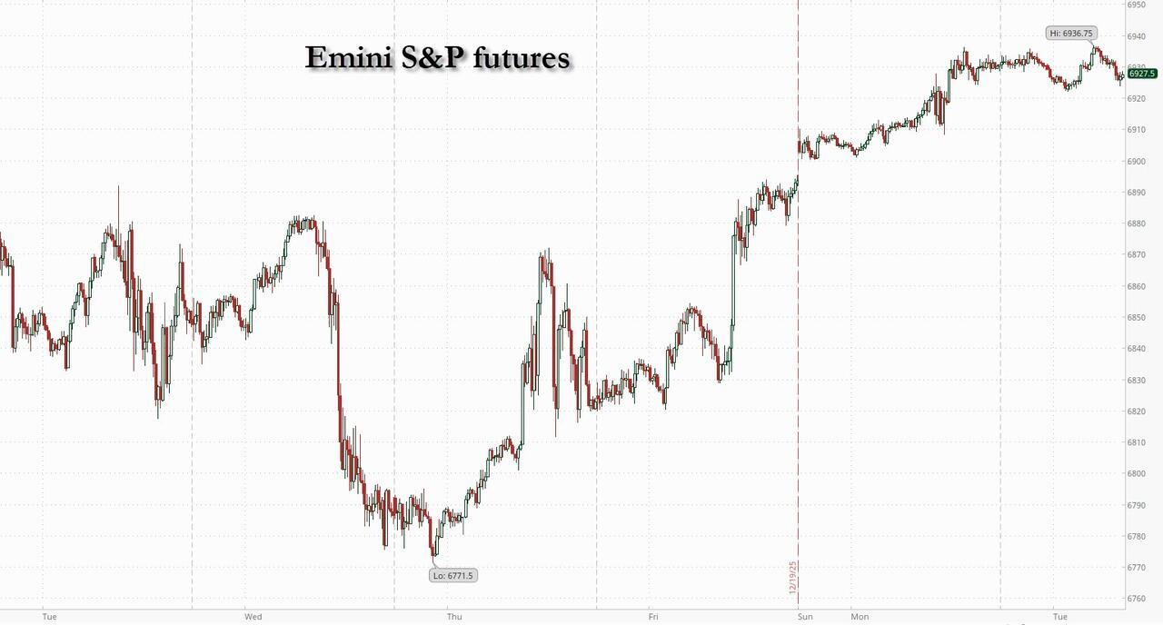 US equity futures are flat, pointing to a muted open off the overnight session highs on the last full trading session before Christmas, as traders await the last remaining data sets of 2025 to see whether they could materially change expectations for Federal Reserve interest-rate cuts. As of 8:0am ET, the S&P 500 is little changed after a three-day rally that has pushed the benchmark within reach of a new all-time high; Nasdaq futures are down 0.1% with Mag 7 names mixed. European stocks are buoyed by a 7% surge in the shares of Novo Nordisk after the Danish firm won US approval to sell a pill version of its obesity drug Wegovy. US Treasuries steadied after days of losses, with the 10-year yield declining two basis points to 4.15%. The dollar fell to the lowest level since October. Gold extended its record-breaking run, setting sights on $4,500 an ounce. Copper rose past $12,000 a ton for the first time. Bitcoin fell again, failing to stage even a modest rebound. The US calendar includes ADP weekly employment change (8:15am), 3Q GDP (8:30am), November industrial production (9:15am), December Richmond Fed manufacturing index, consumer confidence (10am).
