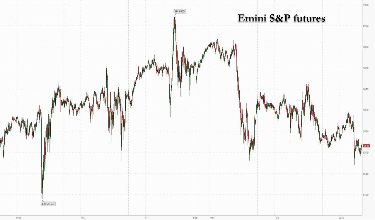 US equity futures are flat ahead of a Fed meeting where a rate cut is assured (the only question is whether it will be hawkish or dovish) and Oracle results later. As of 8:00am ET, S&P and Nasdaq 100 futures are unchanged, with Mag 7 stocks mixed in premarket trading (TSLA +0.5%, META -0.5%, AAPL -0.3%, NVDA -0.2%). Bond yields are mostly unchanged and the USD is flat ahead of the Fed. Commodities are mixed: oil added 0.2%; base metals are lower (copper -1.1%); silver added 0.6% this morning. It’s a big day for capital markets, with SpaceX said to be moving ahead with plans for potentially the biggest IPO of all time and South Korean chipmaker SK Hynix exploring a possible New York share listing. US economic calendar includes 3Q employment cost index at 8:30am and the FOMC decision at 2:00pm.