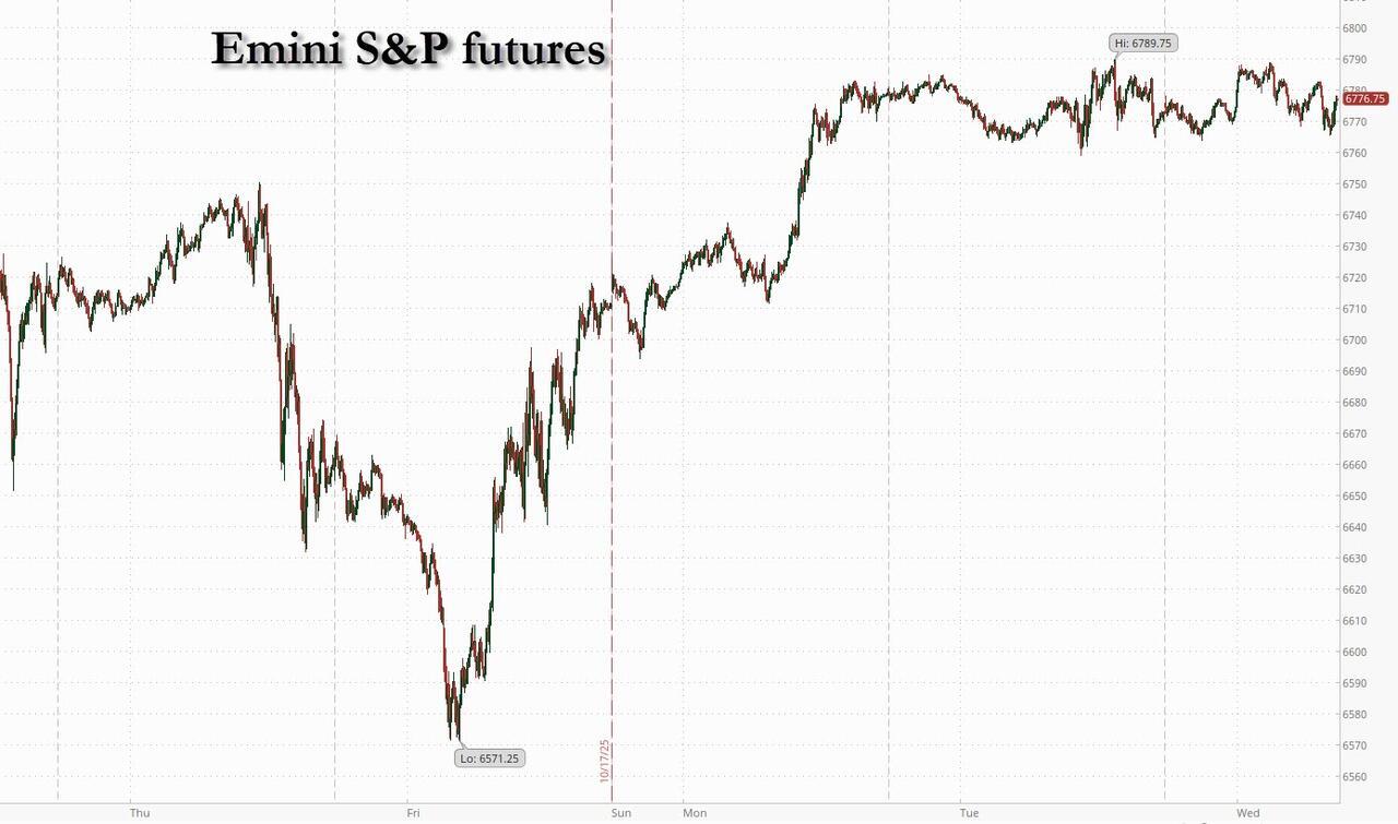US equity futures are flat again, with tech and small caps lagging as traders parsed the latest earnings reports and corporate news amid worries over trade, the US government shutdown and geopolitical risks. Gold and silver extended declines after Tuesday’s slump. As of 8:00am, S&P futures were unchanged while Nasdaq futures dropped 0.2% after a rally on Wall Street lost steam. Pre-market, Mag7 names are mostly weaker ex-GOOG on its cloud deal. Netflix tumbled 6.8% in premarket trading after the streaming-video company reported third-quarter results that missed across the board despite stronger forecasts. Texas Instruments also plunged about 8% on an underwhelming outlook. Meme stocks are back, with Krispy Kreme among those joining Beyond Meat in the retail trader frenzy today. Mining stocks are weaker pre-market though gold and silver are bouncing off their overnight lows; both are underperforming platinum / palladium. The yield curve shifts lower and the USD continues its recent move higher. USD is +2.5% since making a 52-wk low on Sep 16. The balance of the commodity complex is bid with WTI +1.7% the standout on report that US and India are nearing an accord that could lead India to reduce imports of Russian crude. US / China situation still has aides talking behind closed doors as Trump / Xi remain likely to meet next week. There is no macro today .