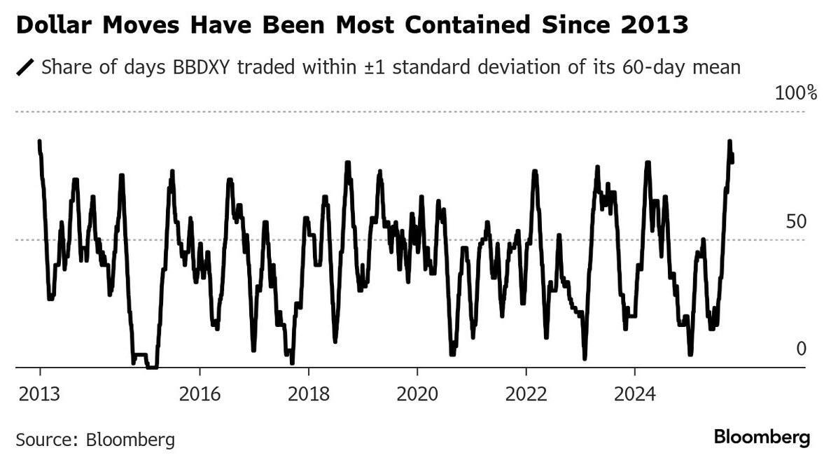 Bond traders are preparing for yields to drop further even as the 30-year sank to its lowest in six months on Tuesday. The cost of protection against a bigger decline in yields across the curve is rapidly rising, according to pricing of options wagers. Traders are piling into some risk-off assets as the US government shutdown becomes the second longest on record and amid renewed concerns over the credit market. Meanwhile, dollar trading has become unusually subdued, with the Bloomberg Dollar Spot Index remaining within one standard deviation of its average for about 80% of the time over the past 60 trading days, according to data compiled by Bloomberg.