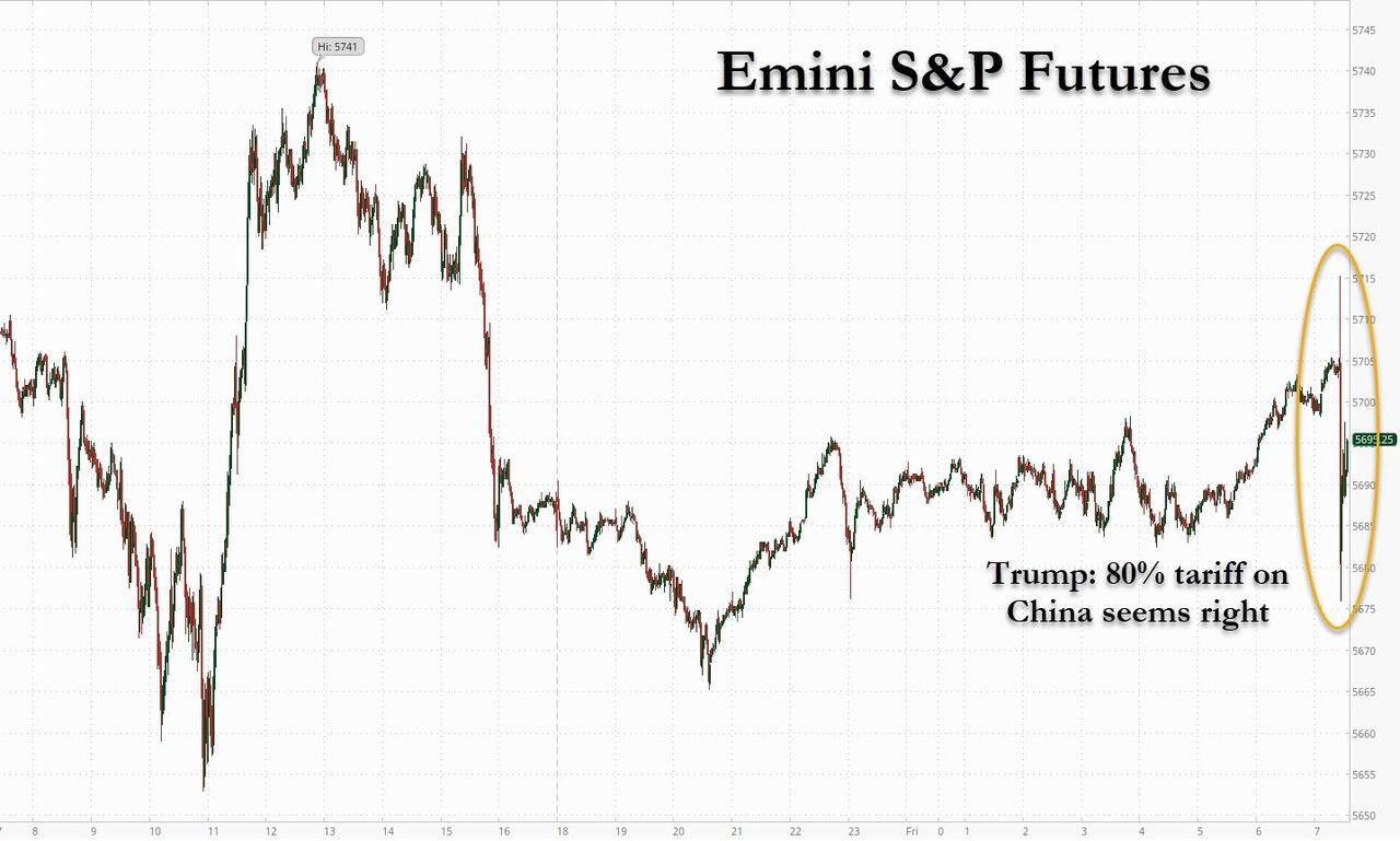 US equity futures traded modestly higher pointing to a third day of gains, until just before 730am ET when Trump decided to play bad cop to Scott Bessent's good cop and posted on Truth Social that "80% Tariff on China seems right!" but then added that the final tariff rate is "Up to Scott B."