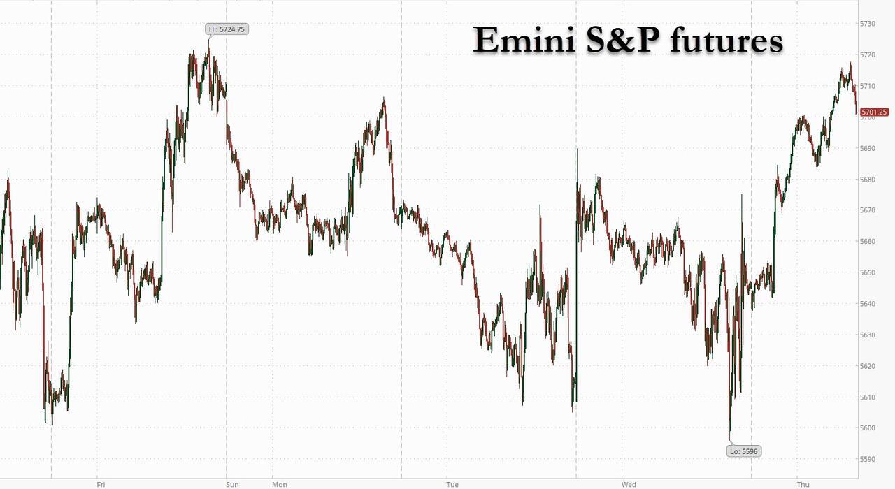 US equity futures storm higher, and are back to their post-Liberation Day highs on positive trade news (Imminent "comprehensive" trade agreement with UK the first of his promised deals; removal of chip export restrictions) and a neutral Fed (economy has strength to wait to see trade war impact hit hard data) even as China again reiterated that the US should cancel unilateral tariffs ahead the first official meeting between the countries this weekend amid reports the US is considering exempting child-related goods from its 145% tariffs on China. As of 8:00am ET, S&P futures rose 0.9% while Nasdaq futures are 1.2% higher, both near session highs. Elsewhere FTSE +40bps, DAX +1.2%, CAC +1%, Shanghai +28bps, Hang Seng +37bps, Nikkei +41bps. Intel rose more than 3% in premarket trading, while peers such as Nvidia and Micron also gained on news Trump will rescind restrictions regulating the export of semiconductors to various countries. Outside of tariffs, Norway and Sweden central banks left rates unch (expected) while we get the BoE this morning (25bps cut expected). US Bond yields are 4-5bp higher across the curve and USD is poised to have its best day 6 sessions with DXY +50bp. Today’s macro data focus is on jobless claims, NY Fed 1-year inflation expectations, and labor costs.