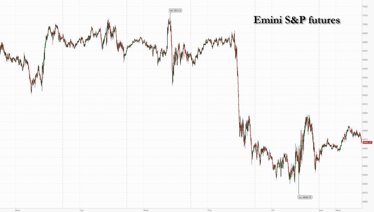 In commdities, gold dipped below $5,000 an ounce, as traders booked profits from a gain in the previous session. Bitcoin tried anf ailed to stage a modest rebound; it last traded around $68,275 after posting its fourth consecutive weekly loss, with the cryptocurrency struggling to find clear direction as a weekend rally fizzled once the momentum ignition algos emerged. WTI crude futures tread water near $62.90 a barrel.