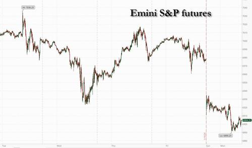 In Europe, the Stoxx 600 is down 1.3%, on track for its worst day in two months. Autos & parts, luxury and tech are seeing a brunt of the selling pressure. There is no US cash trading today, however, futures are notably weaker with the S&P 500 and Nasdaq contracts down 1.1% and 1.5%, respectively. Here are the biggest movers Monday: