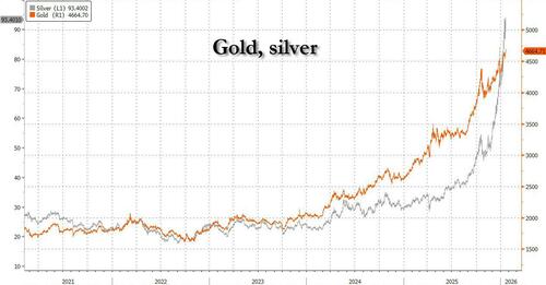 Stocks sold off and gold hit a new record as trade tensions between the US and Europe erupted over Trump’s push to take control of Greenland (which we learn today is due to Norway's snub of Trump for the Nobel peace prize). While US cash markets are closed for the MLK holiday, S&P futures dropped 1.1% and Nasdaq futures tumbled 1.4%, while Europe's Stoxx 600 was on track for its worst day in two months led by luxury stocks and German automakers as BMW dropped 3%. The dollar retreated 0.2%, while the Swiss franc outperformed. Gold topped $4,670 an ounce. US markets are shut today for a public holiday.
