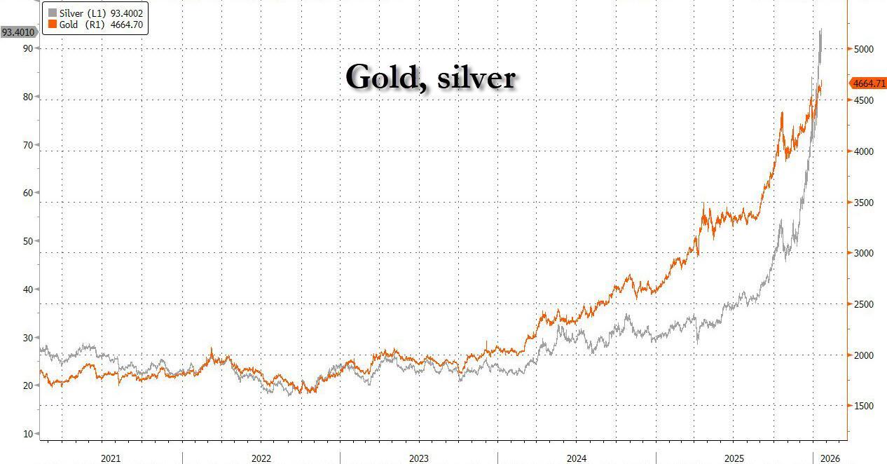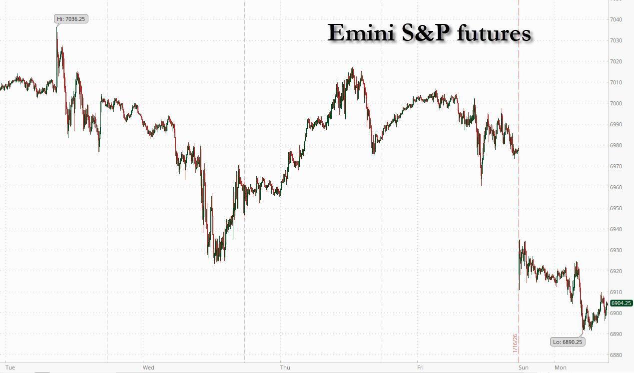 Stocks sold off and gold hit a new record as trade tensions between the US and Europe erupted over Trump’s push to take control of Greenland (which we learn today is due to Norway's snub of Trump for the Nobel peace prize). While US cash markets are closed for the MLK holiday, S&P futures dropped 1.1% and Nasdaq futures tumbled 1.4%, while Europe's Stoxx 600 was on track for its worst day in two months led by luxury stocks and German automakers as BMW dropped 3%. The dollar retreated 0.2%, while the Swiss franc outperformed. Gold topped $4,670 an ounce. US markets are shut today for a public holiday.