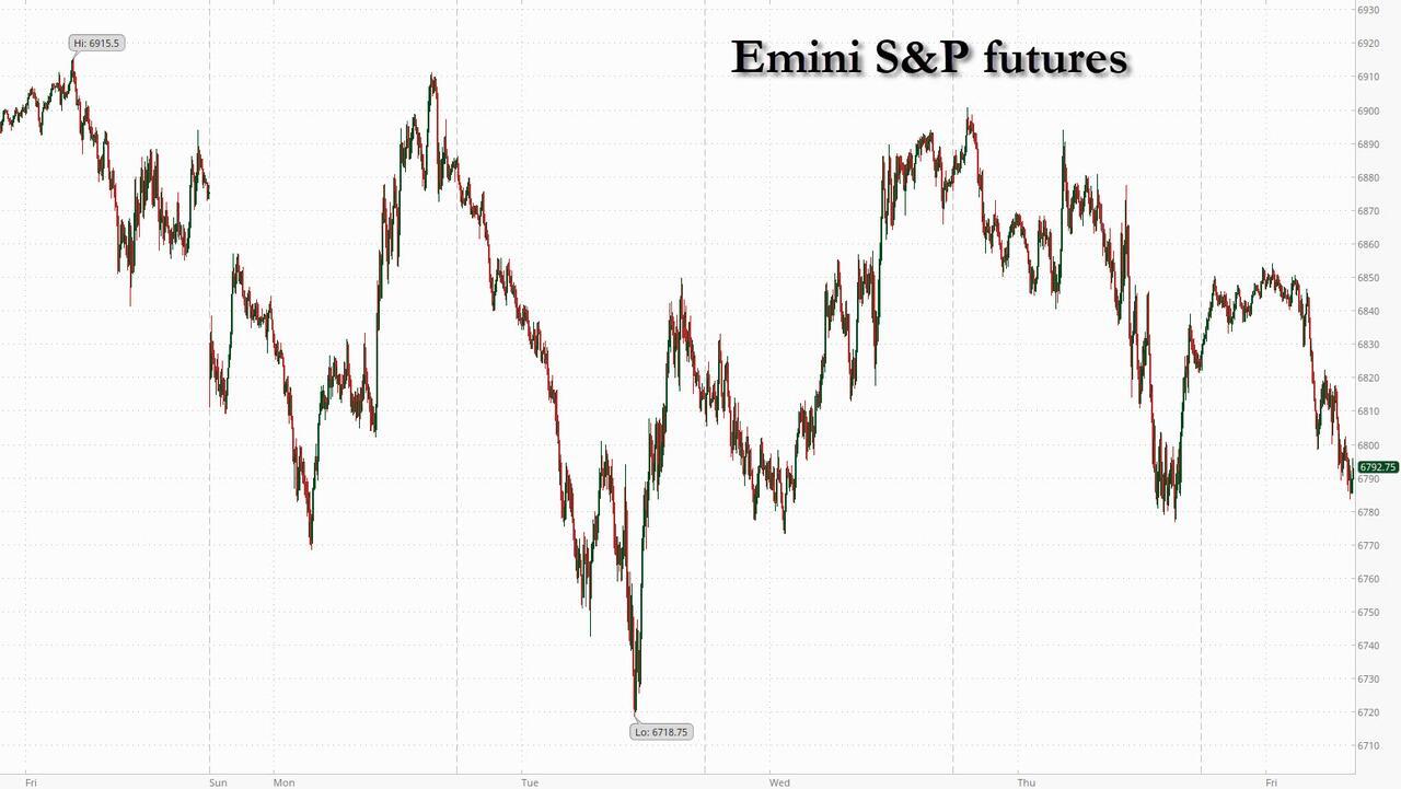 Seven days into the war on Iran and markets are getting increasingly shaky. US equity futures tumbled ahead of the February jobs report, and are on pace to close the worst week for global markets since 2020 deep in the red as the selloff in global bonds deepened after another jump in oil prices fanned fears that the war in the Middle East is fueling inflation. As of 8:00am ET, S&P 500 futures were 0.7% lower while contracts on the Nasdaq 100 fell 0.9% with all Mag7 names lower in premarket trading (NVDA -0.9%, GOOGL -0.6%). The yield on 10-year Treasuries climbed four basis points to 4.18%, on course for its biggest weekly advance since April as global government bonds tumble amid upside risks to inflation from higher energy prices. The dollar gained 0.2% while gold approached $5,100 an ounce. Commodities are mostly higher: Oil added another 6% with WTI now at $86.25; Oil prices are set for their strongest week since 2022, with the war in the Middle East effectively closing the Strait of Hormuz to shipping. Precious metals are mixed (gold down, silver +0.8%); base metals are lower. Overnight, the biggest catalysts was another escalation in Middle East with some articles pointing to potential shutdown in energy exports from Gulf states. Today's US economic data slate includes February jobs report, January retail sales (8:30am), December business inventories (10am) and January consumer credit (3pm). Fed speaker slate includes Waller (7:30am), Daly (8:30am, 10:15am), Goolsbee (9:50am), Paulson (10:15am), Miran (11:30am), Collins (1:20pm) and Hammack (1:30pm, 3:10pm).