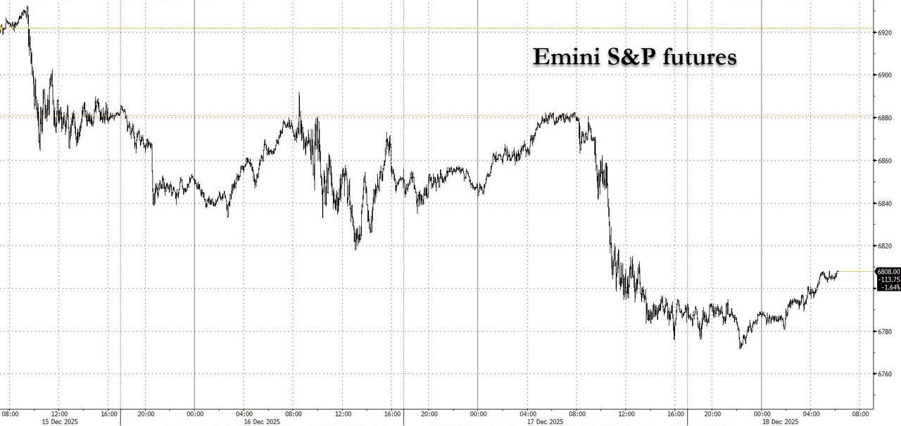 Stocks rebounded from Wednesday's tech-led rout after an upbeat forecast from Micron helped put the brakes on a tech-driven selloff on a busy day for data and central bank meetings. As of 7:15am ET, S&P and Nasdaq futures rose 0.6% following four down days. In premarket trading, Micron shares soared 11% after reporting blowout earnings. Europe’s Stoxx 600 index rose 0.2%, while Asian shares slid. The tech slide, combined with dovish comments from a Federal Reserve official, helped boost Treasuries. The yield on the 10-year was down two basis points at 4.13% even as the BBG dollar index recovered from an earlier loss to trade 0.05% higher. Oil rose modestly to trade +0.4% at $56.18/barrel. Among key events for financial markets Thursday are the release of US inflation data for November, along with monetary policy decisions from the European Central Bank and Bank of England.