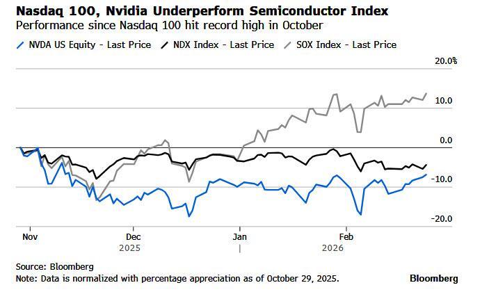 Expectations are high for Nvidia as customers have announced huge capex plans, but a positive stock reaction is key for the Nasdaq after recent underperformance, said Arnaud Girod, head of cross-asset strategy at Kepler Cheuvreux. “We’re in the thick of uncertainty about the disruption of AI with the market de-rating entire segments of the stock market.”