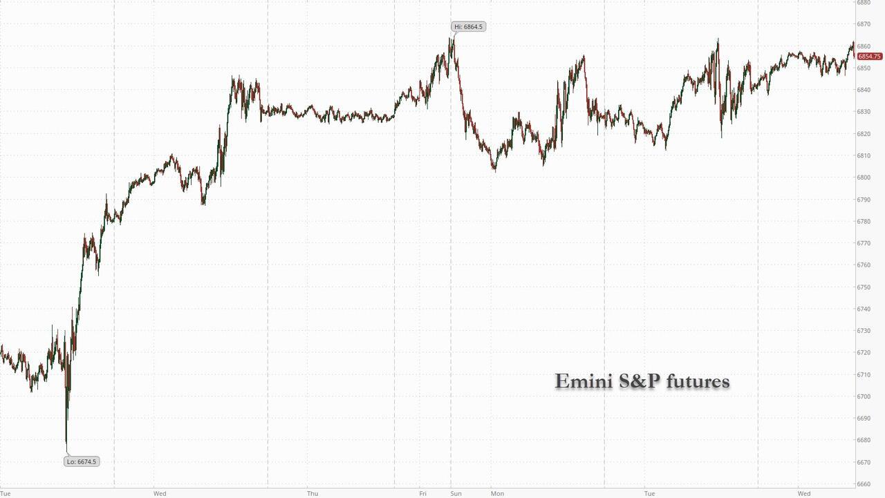 US equity futures are higher again, led by small cap stocks. As of 8:20am ET, S&P futures are up 0.2% (they dropped following a very ugly ADP print at 8:15am), the same as Nasdaq 100 futs, with Mag 7 stocks mostly higher premarket led by NVDA (+0.4%) and AMZN (+0.3%); MRVL is up +10% post-earnings given the robust long-term guidance. Europe's Stoxx 600 is also higher led by tech and energy sectors. Bond yields are lower, the move accelerating after the ADP print; the USD is also lower. Commodities are mixed: Oil higher, while copper hit a fresh record high above $11,350/ton following the largest surge in orders since 2013. Bitcoin extended a tentative rebound on Wednesday, rising as high as $94,000, though sentiment remains fragile. On the news front, increment updates were relatively muted overnight except for MRVL’s positive earnings that trigger the rebound in global tech. The US economic calendar includes November ADP employment change (8:15am), September import/export price index (8:30am), September industrial production (9:15am), November final S&P Global US services PMI (9:45am) and November ISM services (10am).
