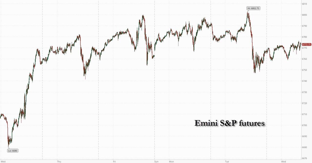 Futures are higher again, reversing Tuesday's modest Oracle-led decline, and are led by small caps despite additional multi billion tech investment headlines. As of 8:00am ET, S&P 500 futures were 0.1% higher, set for their 8th gain in the past 9 days, with Nasdaq 100 contacts +0.2% with Mag7, Semis, and AI-themed plays all rallying off the investment news. In premarket trading, AMD extended gains after an explosive rally following its multibillion-dollar AI deal with OpenAI. Tesla advanced after it unveiled a cheaper version of its top-selling electric vehicle. Cyclicals poised to outperform Defensive even as Ray Dalio warned that the AI-driven market rally “feels frothy.” Of course, it is all now just a debasement trade with everyone and their mother dumping fiat and buying hard currencies, sending gold above $4,000 an ounce for the first time, and silver above $49. The dollar gained for a third day against major peers and is now 2.5% off its 52-wk low as 96.00, while Treasury yields dipped. In commodities, Energy and Precious metals are the stand outs as gold breaks above $4k. The Administration said ~$13bn in farming aid may be rolled out soon. Today we get the FOMC minutes at 2pm; the Federal Budget Balance will likely be delayed due to the government shutdown.