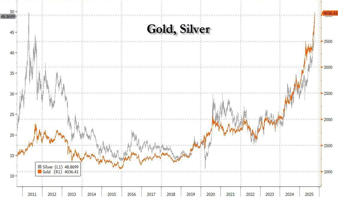 As noted last night, the global currency debasement trade pushed Gold above $4,000 an ounce for the first time ever, with silver rising above $49 for the first time since 2011 and on pace for a new record high.