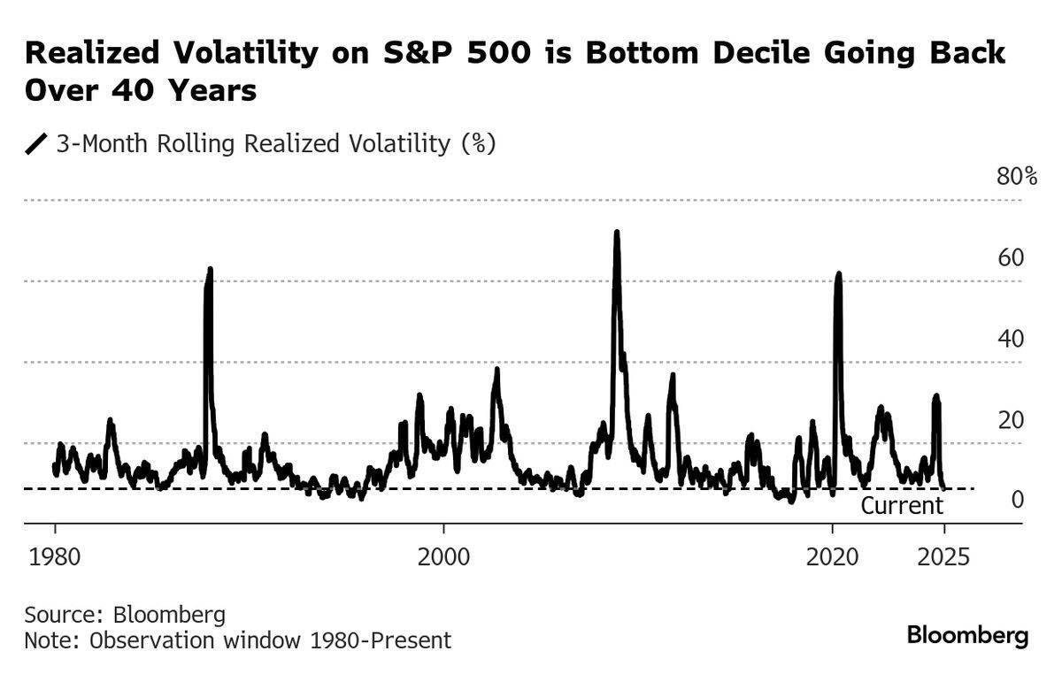 And with nobody willing to sell first, equity volatility remains deeply subdued, despite a growing list of potential cracks beneath the surface. According to Bank of America, S&P 500 three-month realized vol sits near 8.5%, its lowest decile since 1990.
