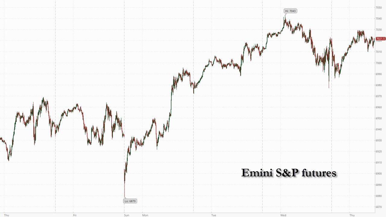 Futures are higher, led by tech, after the first batch of Mag7 earnings with gold breaking new record highs again, rising as high as $5600. As of 8:00am ET, S&P futures are up 0.2% while the Nasdaq if barely in the green; pre-mkt it's a mixed picture with META (+7.9%) rising on higher than expected capex forecast, while MSFT (-6.6%) tumbles on... higher than expected capex forecast; TSLA is also modestly in the green, up +2.8%; AAPL reports today today then AMZN / GOOG next week. Cyclicals are trading higher led by Energy and Industrials and the AI theme also acting well as capex / fundamentals remain supportive of growth. The yield curve is twisting steeper with the USD flat. Commodities remain bid across all 3 complexes with WTI (Iranian supply fears) and precious (fiat incineration trade) the most notable. Today’s macro data focus is on jobless claims though given Powell’s comments yesterday, Friday’s PPI is more important.
