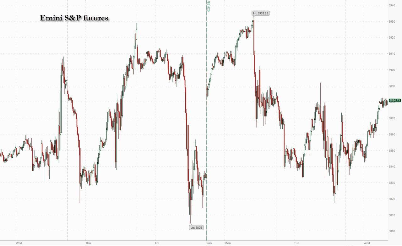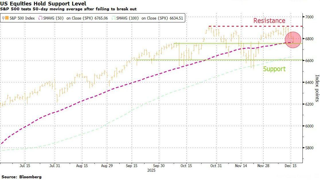Stock futures are higher but with less than 10 full trading days left in the year, the Santa rally seems increasingly elusive, with traders struggling to find catalysts. The S&P 500 tested a key technical level on Tuesday, coming close to breaking below its 50-DMA. As of 7:15am ET, S&P 500 futures rose 0.3%, pointing to the first increase in four days for the S&P 500 as investor appetite returned after last week’s tech retreat; Nasdaq contracts +0.4%: Netflix rose 1.7% in premarket trading on bets it will prevail in its bid for Warner Bros. Discovery.Amazon rose 2% on report OpenAI is in initial discussions to raise at least $10 billion from Amazon and use its chips. Trading volumes are still relatively high, though will inevitably start to tail off as Christmas approaches. The main action today is in oil, with Brent prices bouncing 2.2% from a four year low back over $60, after Trump ordered a blockade of sanctioned tankers going into and leaving Venezuela, while the US is once again considering sanctions on Russia if Putin rejects the proposed Ukraine peace deal. Gold also jumped. 10Y treasury yields rose 3bps to 4.18% and the dollar index was at session highs. US economic calendar blank for the session. Fed speaker slate includes Waller (8:15am), Williams (9:05am) and Bostic (12:30pm)