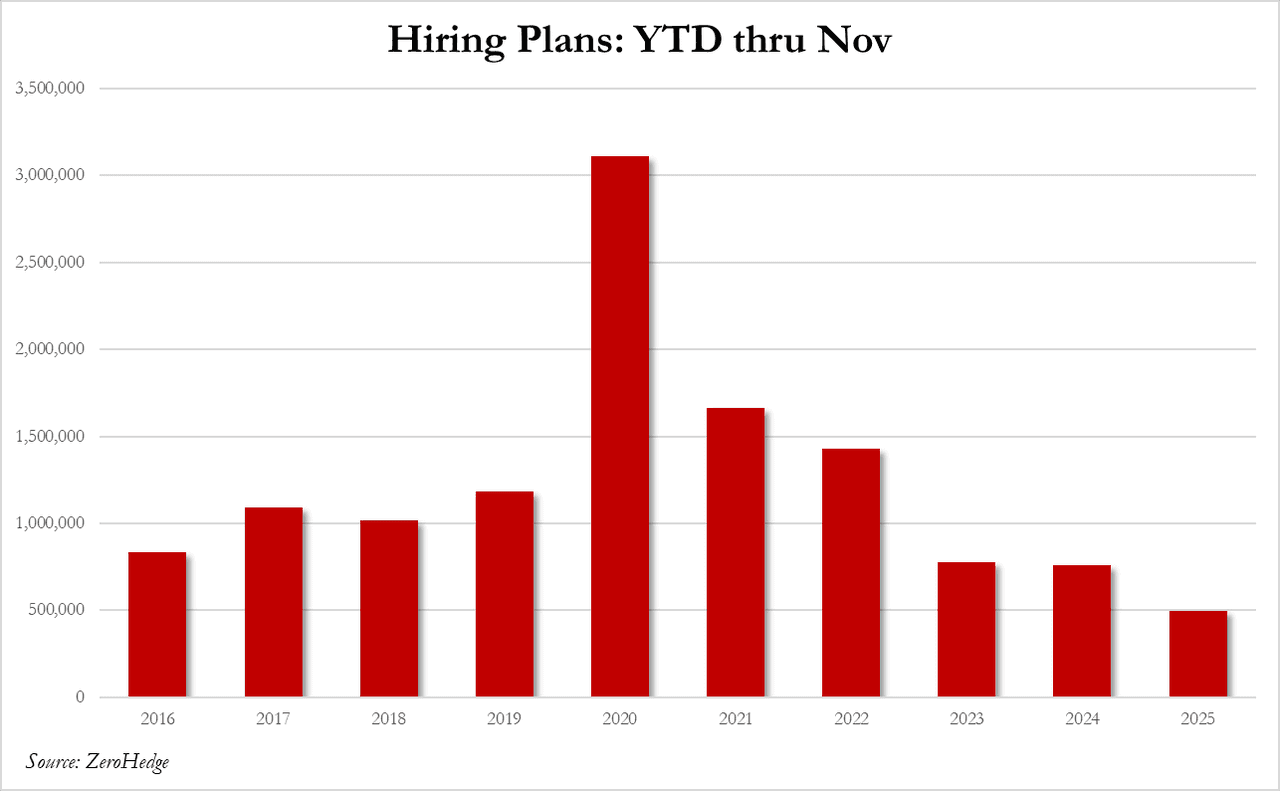 A report on corporate job-cut announcements from Challenger, Gray & Christmas Inc. added to evidence that the US labor market is softening. Announced layoffs fell last month after surging in October, but were still the highest for any November in three years, according to the outplacement firm. Meanwhile, YTD hiring plans are the lowest since 2010.